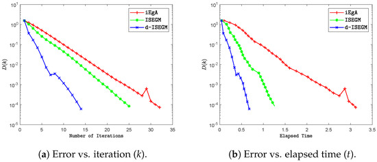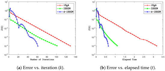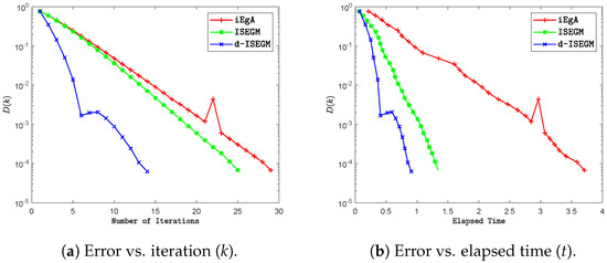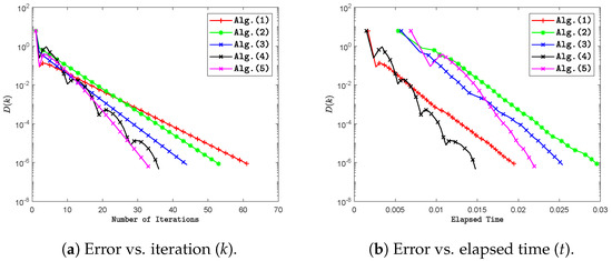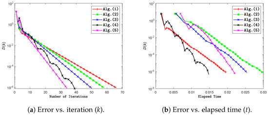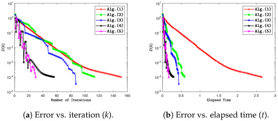 Graph illustrating a comparison between Algorithms 2 and 3 and other algorithms, depicting the relationship between the error and the iteration number as well as the elapsed time. This numerical experiment was conducted using .