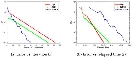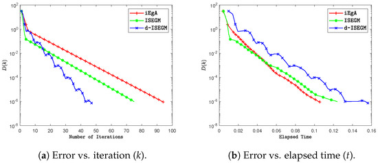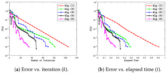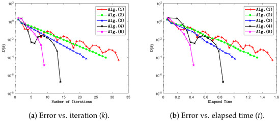 Next, we conduct two numerical experiments to evaluate the computational efficiency of Algorithms 2 and 3 compared to Algorithm 3.1 [46], Algorithm 3.2 [47], and Algorithm 3.1 [48]. The graphs of the errors are plotted against the number of iterations and CPU time in each case. The parameter settings are as follows: