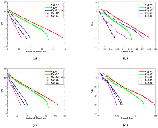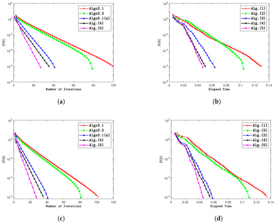 The graphs compare the performance of Algorithms 2 and 3 with Algorithm 3.1 [46], Algorithm 3.2 [47], and Algorithm 3.1 [48], showing error vs. iterations and elapsed time. (a) Error vs. iteration while . (b) Error vs. elapsed time while . (c) Error vs. iteration while . (d) Error vs. elapsed time while .