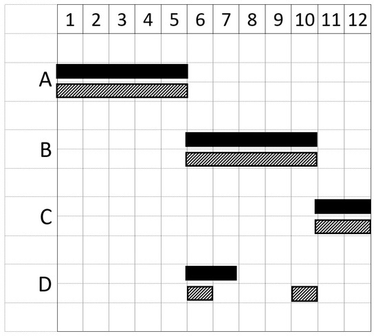 A four-activity project, detailed in Table 1, is used to show how splitting allows the project to remain on schedule despite financial constraints and incurring extra costs for splitting. Among the four activities, only activity D is eligible for splitting, which introduces an additional cost of USD 120,000—30,000 to pause the activity and USD 90,000 to resume it. The original project schedule spans 12 months and is shown with solid bars in Figure 1. The modified schedule, where Activity D is split, is illustrated with hatched bars: the first half of Activity D is completed in month six, and the remaining half in month ten.