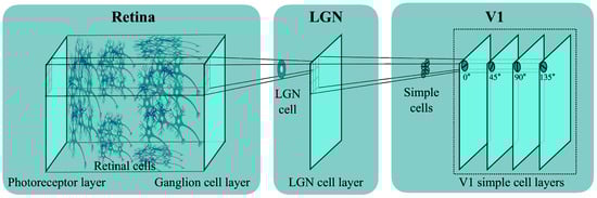 The retina is composed of various neuronal cell types, including photoreceptors, bipolar cells, ganglion cells, horizontal cells, and amacrine cells [7,8,9]. Photoreceptors convert light signals into electrical signals [9], which are subsequently transmitted by bipolar cells to ganglion cells [8,10]. Bipolar, horizontal, and amacrine cells contribute to lateral modulation processes that enhance contrast and edge detection abilities while also facilitating the processing of complex visual information, such as motion detection and regulation of light intensity [11,12]. The processed information within the retina is then transmitted from ganglion cells to the lateral geniculate nucleus (LGN) cells [13]. The LGN serves as an intermediary relay station of information transmission between the retina and brain, while also carrying out initial processing of visual information [14]. Moreover, LGN cells exhibit receptive fields that are organized into concentric excitatory (ON) and inhibitory (OFF) regions, characterized by center-surround antagonistic structures [15]. Subsequently, the processed visual information is transmitted from LGN cells to the primary visual cortex [14,16].