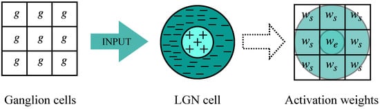 LGN cells in AVS receive ganglion cell outputs to perform initial stimuli responses. The receptive fields of LGN cells are characterized by a center-surround antagonistic arrangement with excitatory (ON) and inhibitory (OFF) regions [15]. In this study, we employed ON–OFF type LGN cells and approximately represented the receptive field property using specific activation weights, as illustrated in Figure 3.