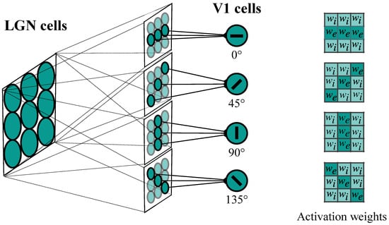 Hubel and Wiesel conducted groundbreaking work in the field of orientation selectivity, revealing that certain V1 neurons in cats exhibit selective responses to specific orientational visual stimuli [18,19,20]. Orientation selectivity refers to the robust response of V1 neurons to preferred orientations and their weak response to non-preferred stimuli [13,46]. The V1 neurons demonstrating local orientation selectivity are referred to as simple cells [20]. These mechanisms of neuron response were subsequently discovered in other mammals, highlighting the universal nature of orientation selectivity [47,48]. Moreover, while newborn mammals already possess a certain degree of orientation selectivity in the visual cortex, it is important to note that visual experience significantly influences the development and refinement of this neural mechanism [49,50,51,52,53].