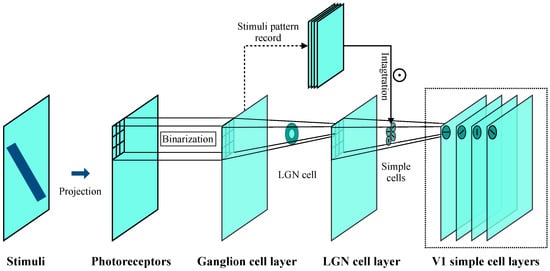 The orientation selectivity of V1 simple cells is generated through the integration of outputs from LGN cells [46]. Figure 4 illustrates the generation of orientation selectivity and two instances of stimuli patterns.