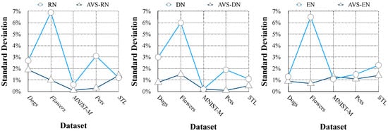 Summarize the error rates and standard deviations of overall model performance on various datasets based on three repeated image classification tasks to evaluate AVS–CNNs’ stability and robustness. The results are presented in Table 3, Values are reported as mean error rate and standard deviation (n = 3 seeds). The standard deviation curves are depicted in Figure 8. Notably, the standard deviations of AVS–CNNs consistently remained within 2%, exhibiting significantly lower fluctuation compared to corresponding base CNNs. In short, AVS enhanced the robustness of the backbone model, leading to stronger reliability and stability in the performance of AVS–CNNs.