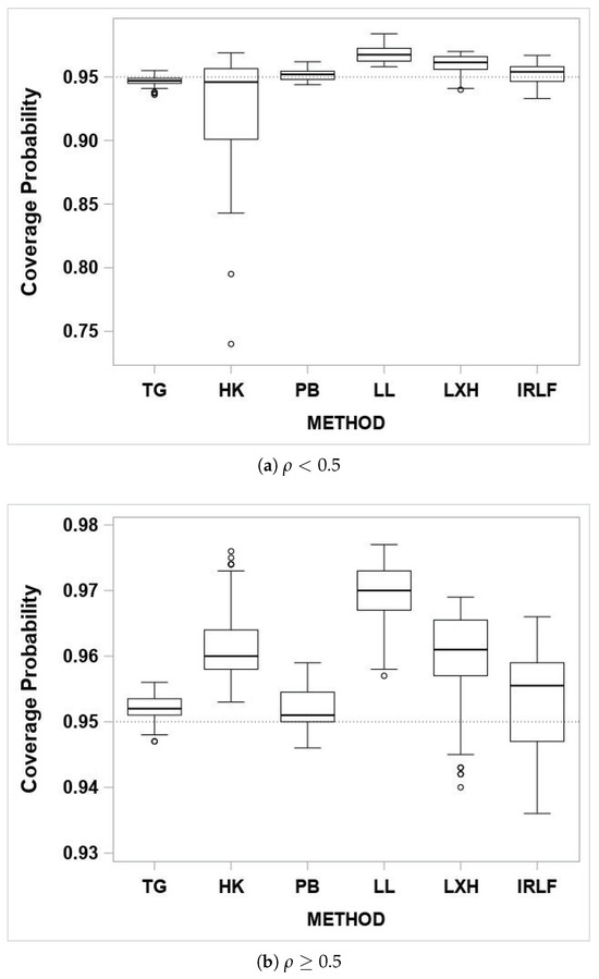 Figure 1 displays the coverage probability for all competing methods with and . The TG, PB, and IRLF methods maintain the nominal level, where , and they obtain higher than the nominal level where . The HK method obtains lower than the nominal level where , and it obtains higher than the nominal level where . The LL and LXH methods obtain higher than the nominal level for all situations.