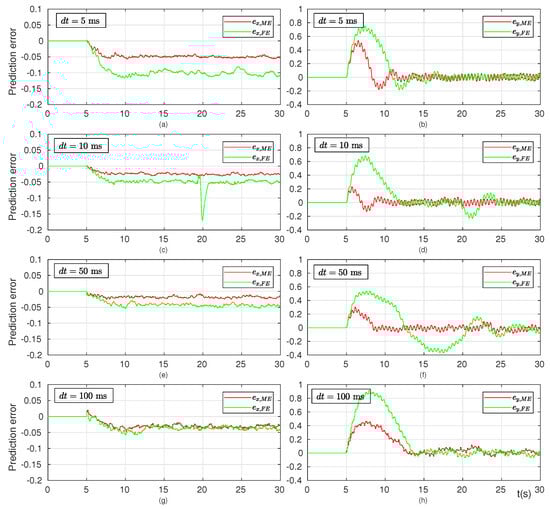 Performance of convex MPC using FE and ME discretization method. (a,c,e,g): Prediction errors in the x-direction with sampling intervals of 5 ms, 10 ms, 50 ms, and 100 ms; (b,d,f,h): Prediction errors in the y-direction with sampling intervals of 5 ms, 10 ms, 50 ms, and 100 ms.