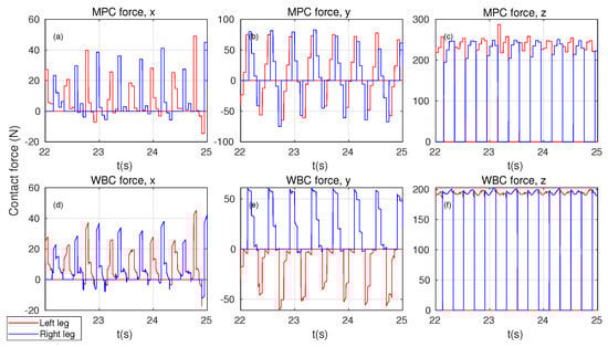Ground reaction forces optimized by MPC and WBC. (a–c): Ground reaction forces predicted by MPC; (d–f): Ground reaction forces optimized by WBC.