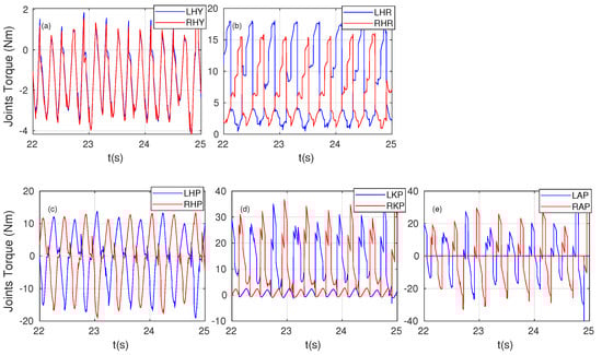 Joint torques of both legs optimized by WBC. (a): Performance of hip yaw joint torque; (b): Performance of hip roll joint torque; (c): Performance of hip pitch joint torque; (d): Performance of knee pitch joint torque; (e): Performance of ankle pitch joint torque.