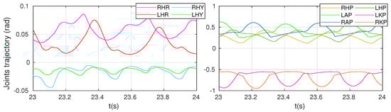Figure 4 and Figure 5 show the joint torques performance and joint trajectories response, respectively. In the figure, the abbreviations in the legend are defined as follows: LHY represents “left hip yaw”, LHP represents “left hip pitch”, LHR represents “left hip roll”, LKP represents “left knee pitch”, and LAP represents “left ankle pitch”. Similarly, R indicates the right, and the other abbreviations follow the same naming convention. From Figure 4, it can be seen that the optimized torques output by the WBC satisfy the physical constraints of the joint torque limits. The hip yaw joint contributes minimally during forward walking, requiring only a small torque for stabilization. Notably, the hip yaw motors of X02 rotate in opposite directions; to maintain stability in the yaw direction, the torque control commands exhibit a synchronized trend. During the swing phase, the knee pitch experiences nearly zero torque, while during the support phase, it generates significant torque. The pitch joints of the hip, knee, and ankle exhibit periodic contributions during the transition between the stance and swing legs. From the right subplot of Figure 5, it can be observed that since the motor angles are zero when X02 is standing upright, the knee pitch angle during walking approximately equals the sum of the hip pitch and ankle pitch angles to maintain the stability of the center of mass.