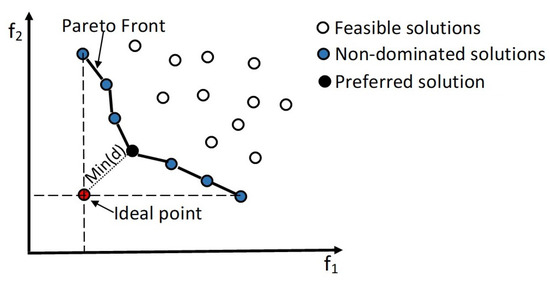 Firstly, we find the ideal point (see Figure 2) in the objective space by calculating the minimum objective value for each objective over all the given offline data and referring to it as . Next, we find the non-dominated solutions from all the solutions given. After that, the vector is defined as the nearest non-dominated point of the in the objective space as follows: