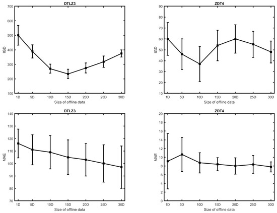 We examine how initial offline data affect our algorithm’s performance in this subsection. With the LHS sampling approach, we have created a variety of offline data sizes, including 1D, 5D, 10D, 15D, 20D, 25D, and 30D (D is the number of decision variables) using two test instances. Because the IGD values in these two cases deviate greatly across different sizes, we chose DTLZ3 with M = 3 and ZDT4 with M = 2 for this experiment. The mean and standard deviation of the IGD and MAE values generated by AdaMoR-DDMOEA on various offline data sizes are presented in Figure 3.