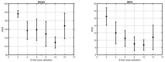 The goal of k-fold cross-validation is to obtain a more reliable estimate of a model’s generalization performance on unseen data and to reduce the risk of overfitting. So, determining the suitable value of k is crucial, as it can impact our adaptive model selection strategy in choosing the most robust model. Thus, we choose 2, 4, 6, 8, 10, and 12 as a set of reasonable numbers for k. The MAE values with the mean and standard deviation achieved for DTLZ3 and ZDT4 have been plotted in Figure 6.