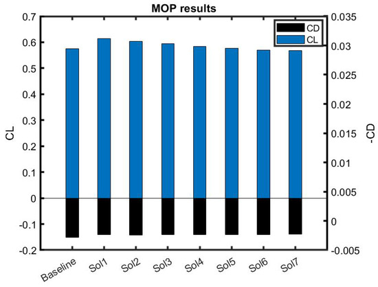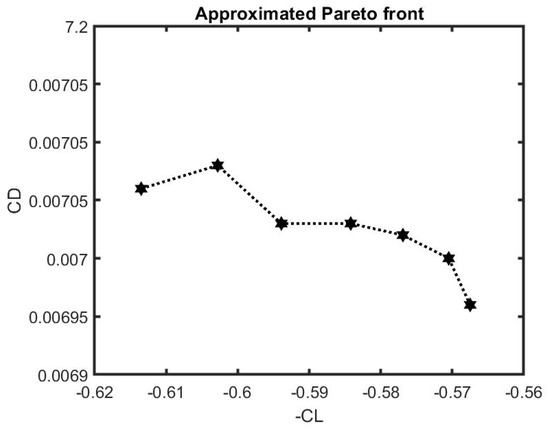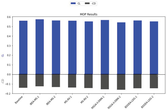 The final approximated Pareto optimal front obtained by AdaMoR-DDMOEA is plotted in Figure 7. Figure 8 illustrates the optimum airfoil geometries, with the first, middle, and final Pareto solutions chosen for simplicity. Figure 9 shows the stacked charts of the lift and drag coefficients for the eight points. Figure 10 shows the stacked charts of the lift and drag coefficients for the two best points of the four compared algorithms, namely IBEA- MS, MS-RV, NSGA-II-DNN, and BDDEA-LDG, against the baseline. As can be observed, using our algorithm, the lift coefficient can be increased, and the drag coefficient can be decreased and gives a better result (more lift and less drag) than the compared algorithms. Particularly, the two objectives in Pareto solutions 1, 2, and 3 improve upon the baseline design.