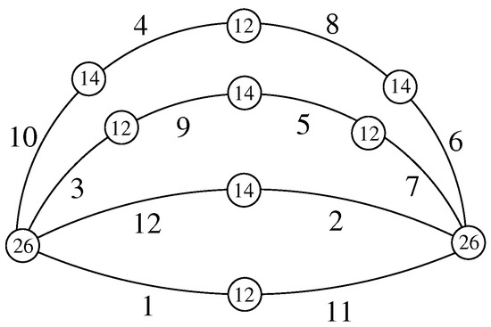 We must have . So, the tripartite 6-bridge graphs are , , , and , respectively. A local antimagic 3-coloring for with colors 25, 30, 80 is given in Figure 3.