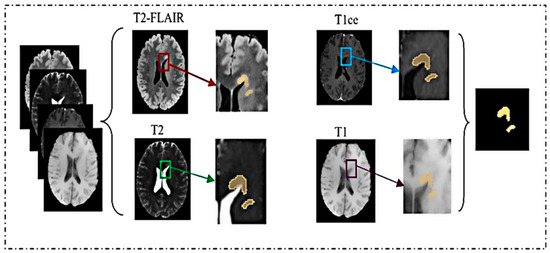 Schematic representation illustrating the sequential processing of MRI modalities T1, T2, T1ce, and FLAIR, as implemented in our segmentation approach for pixel classification within the context. Different colors represent the same region of different modalities.
