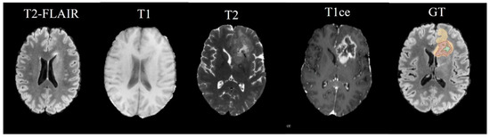 BRATS21 is a large-scale brain multimodal MR Glioma segmentation dataset, including 8160 MRI scans from 2040 patients. Among them, 1251 cases of data were used as training sets and publicly labeled, while 219 cases of data were divided into validation sets and 570 cases of data were used as test sets. MR Images are given for each patient in four modalities in Figure 4.