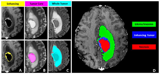 The tumor sub-regions annotated are based on observable features recognizable by trained radiologists (referred to as VASARI features) and include the following. The Gd-enhancing tumor (ET) labeled as 4, which represents the enhancing part of the tumor visible on T1Gd MRI scans, including areas of strong and faint enhancement. The peritumoral edematous/invaded tissue (ED) labeled as 2, which is characterized by an abnormal hyperintense signal on T2-FLAIR volumes, encompassing the infiltrative non-enhancing tumor and vasogenic edema in the peritumoral region. The necrotic tumor core (NCR) labeled as 1, which appears hypointense on T1Gd MRI and represents the non-viable, necrotic center of the tumor. This is illustrated in Figure 5.