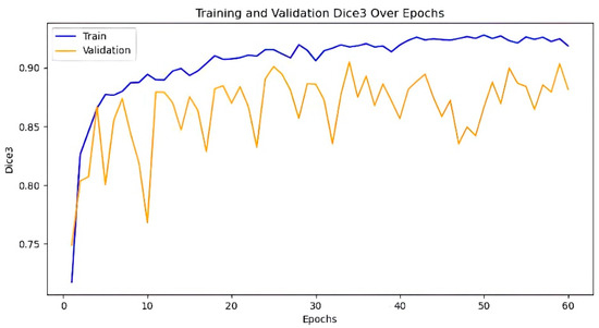 The dimensions of the input patches dictated the use of an NVIDIA Tesla V100S-PCIe GPU with 32 GB of High-Bandwidth Memory (HBM2) for the processing of individual patches, rather than the processing of multiple patches in minibatches. Consequently, the Adam optimization technique is adopted, with a constant learning rate of 0.001 and an increased momentum of 0.99 to ensure the stability of gradients. In all experimental iterations, the parameters λ = 0.1 and β = 0.3 were applied, underscoring a segmentation strategy that prioritizes the precision of the model’s predictions, specifically aiming to prevent the inadvertent inclusion of background voxels within the segmented object. This strategy, while ensuring the comprehensive detection of all pertinent voxels, is essential for achieving precise and reliable segmentation outcomes that meet the specific requirements of the task. For the changes in the loss function, please refer to Figure 6, Figure 7, Figure 8 and Figure 9.