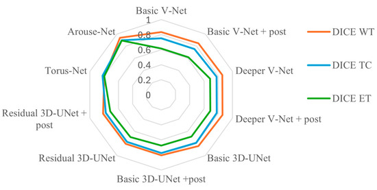 Furthermore, augmenting the model’s depth, exemplified by the progression from Basic V-Net to Deeper V-Net, generally leads to improved segmentation accuracy, especially notable in the context of enhanced tumors (ET). The 3D U-Net and its derivatives, namely Basic 3D-UNet and Residual 3D-UNet, consistently demonstrate high performance in segmentation tasks, particularly in discerning the tumor core (TC) and enhanced tumor (ET), where the incorporation of residual connections appears to confer an additional performance benefit, which, through the application of arouse convolutions, achieves superior Dice coefficients in the segmentation of both the whole tumor (WT) and enhanced tumor (ET), underscoring its robust feature extraction capabilities.