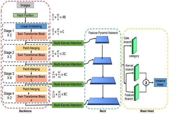 where the results for and represent the output features from the W-MSA and MLP modules for the lth block, respectively. Similarly, and refer to the resulting features of the SW-MSA and MLP modules for the th block. The structure is consistent from stages 2 to 4, including patch merging layers and Swin transformer blocks. The patch merging layer efficiently combines four patches simultaneously, reducing the image’s height and width by half. As illustrated in Figure 1, each stage operates at a different resolution; for example, stage 1 operates at a resolution of ×. After the patch merging layer in stage 2, the resolution becomes ×, and this pattern continues, with stage 3 at ×, and the final stage presenting a resolution of ×. Although the resolution decreases at each stage, the number of input channels, denoted by C, increases to capture more in-depth and complex relationships across different stages. In the top-down pathway, the outputs from various stages, with feature maps or channels Ci dimensions of 96, 192, 384, and 768, are processed through the proposed multi-kernel attention (MKA) module. This module is designed to enhance the model’s feature representation capabilities, particularly for instance segmentation. The refined features are then forwarded to the neck, or feature pyramid network (FPN), to improve the detection of objects across different sizes. The aggregated feature maps with information from various FPN levels are directed to the mask head. This architecture can create instance masks without relying on bounding boxes, facilitating precise segmentation tasks.
