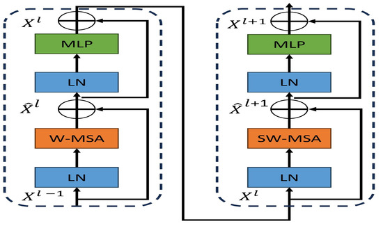 The Swin transformer block, as illustrated in Figure 2, comprises two sequential blocks that form the core of the Swin transformer backbone. These blocks include two important modules: W-MSA and SW-MSA. The W-MSA module, or window-based multi-head self-attention, further partitions the image blocks into non-overlapping regions to calculate self-attention within these regions. The SW-MSA module, known as shifted-window multi-head self-attention, divides non-overlapping windows at layer l and reduces the window distance by half at layer , allowing window information from different levels to interact. In addition, the Swin transformer block features two Multi-Layer Perceptron (MLP) modules and two LayerNorm (LN) modules. A LayerNorm (LN) layer precedes each MSA module and MLP, with a residual connection following each module. The incorporation of the W-MSA and SW-MSA modules facilitates the flow of information across windows. The transformer block computations are given in Equation (1):