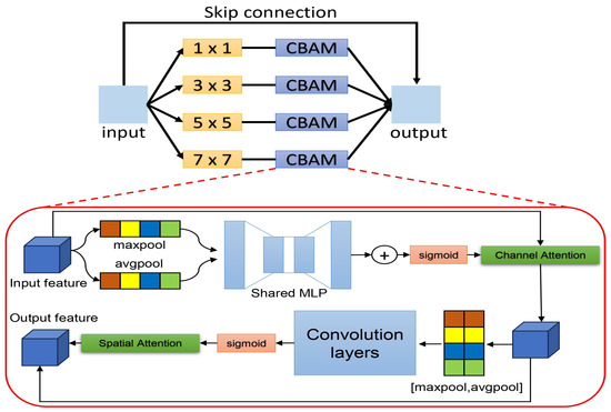 The MKA module, as illustrated in Figure 3, incorporates a residual structure and a multi-kernel design to enhance feature learning. Initially, the backbone’s output features are processed through 1 × 1 convolutional layers to reduce the channel size to 256, preparing them for the MKA module. This module has four convolutional layers with kernel sizes of 1, 3, 5, and 7 for multiscale feature extraction. Each kernel size is designed to capture various spatial patterns and levels of information in the feature maps. For instance, the 1 × 1 and 3 × 3 kernels are effective at extracting fine-grained features from smaller objects, while the larger kernels, 5 × 5 and 7 × 7, are better at capturing more global patterns and larger structures. Skip connections are used to avoid the gradient vanishing problem. The feature maps generated by each kernel size are then processed through CBAM [47], allowing the network to focus on the most informative features, thereby improving the accuracy of segmentation, especially in cluttered marine environments. Within the CBAM block, highlighted by a red rectangular box, are two main branches: channel attention and spatial attention. The channel attention branch generates an attention map that determines the inter-channel relationships, focusing on the important channel for each kernel size. This process involves deriving global features (dimensions of 1 × 256) via global average-pooling and max-pooling layers, denoted as and . These are then fed into a shared network that produces a channel map ∈ with a singular hidden layer, where ‘c’ represents the number of channels. A reduction ratio ’r’ is applied to optimize the parameters, denoted as . Element-wise addition is used to merge the resulting feature maps. The computation of channel attention is given in the following Equation (2):