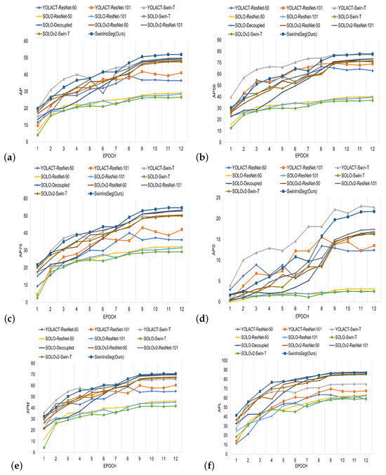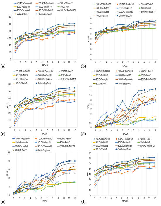 Accuracy vs. epoch curves for the ShipInsSeg dataset, evaluated using the COCO metrics. (a) The AP curve, which highlights the overall performance of the models over the training epochs. (b) The AP50 curve. (c) The AP75 curve, which indicates performance at an IoU threshold of 75%. (d) The APS curve. (e) The APM curve, which evaluates medium-sized ships. (f) The APL curve. Our SwinInsSeg curves are shown in indigo blue. (Best viewed in color).