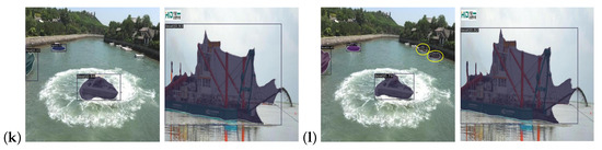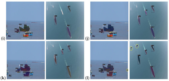 Our model, SwinInsSeg, reduced the problem of scale variation in ships, as shown in subfigure (l), and could accurately detect and segment ships. Furthermore, our model efficiently recognized and segmented multiple ships. Our model also detected and segmented new ships, which are represented by a yellow circle.