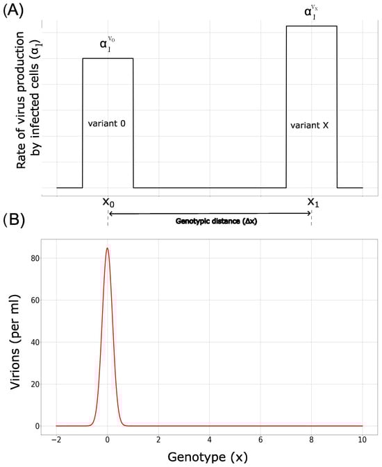 (A) Schematic representation of the function considered for the rate of virus production by infected cells (). It characterizes a fitness landscape that consists of two variants: the original variant that infected the host (variant 0), whose rate of virus production by infected cells is , and the hypothetical variant that could emerge (variant X), which has a rate of virus production by infected cells of . The genotypic distance, defined by , separates the centers of the two variants. (B) The initial condition that is considered for the virus density . It is a Gaussian function centered at 0 and that has a standard deviation equal to 0.2.