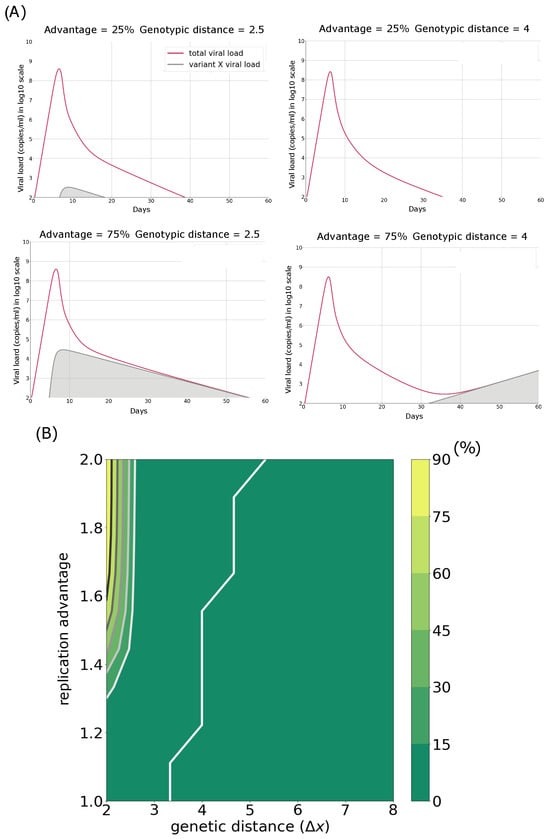 (A) The effect of variant X emergence on the course of the infection for different values of the replication advantage and the genotypic distance. The viral load generated by variant X in each case is represented in gray color. (B) The percent of the viral load generated by variant X, when divided by the total produced viral charge for different values for the variant X replication advantage and the genotypic distance that separates it from variant 0.