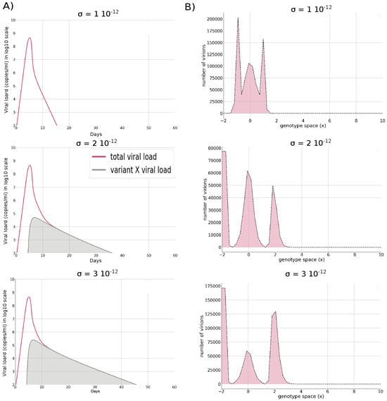 (A) The effect of the mutation rate on the kinetics of the viral load and the emergence of variant X. The viral charge generated by the latter is shown in gray color. (B) The distribution of the virus as a function of the genotype at the beginning of day 8, when three values of the mutation rate are considered.
