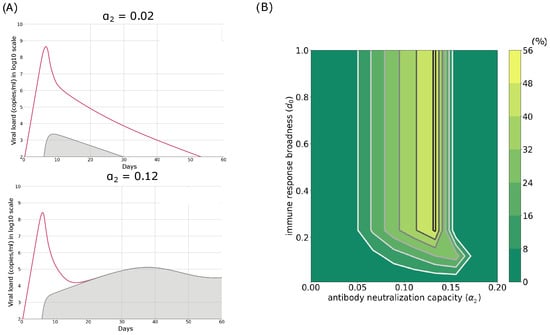 The viral kinetics of RNA viruses are highly heterogeneous, which suggests that some of the model parameters can be different for each patient. In particular, it is shown that the elderly population generates antibodies with lower neutralization capacity than younger individuals [35]. In this analysis, we evaluate the impact of the efficacy and broadness of the immune response on the risks of variant X emergence and transmission (Figure 4). In particular, we study the risk of the emergence of a variant separated from the original variant with a genotypic distance equal to and that has a 50% replication advantage over variant 0. We run systematic numerical simulations, where we consider different values of antibody efficacy and immunity broadness . For each case, we evaluate the risk of variant X emergence and transmission by calculating the ratio of the AUC of variant X viral load out of the AUC of the total viral load. In the situation where immunity is sufficiently broad ( and the neutralization efficacy is high (), the infection ends without the emergence of variant X. In this case, antibodies eliminate all virions before they acquire a sufficient number of mutations to evolve into variant X. As we decrease the value of the neutralization rate () to a value from 0.07 to 0.13, we observe that variant X quickly becomes dominant, while variant 0 goes extinct (Figure 4A, bottom). This is because antibodies exert a selective pressure that promotes the emergence of the fittest variants. When we consider a low rate of virus neutralization by antibodies (), variant X emerges but does not become dominant because it can hardly compete for healthy cells with variant 0, which is also not easily eliminated by antibodies (Figure 4A, top). Further, we observe that the interval of antibody efficacy that promotes the emergence of variant X is larger for low values of immunity broadness (Figure 4B). However, variant X does become dominant in this case.
