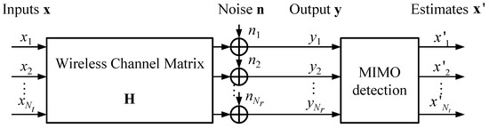 Multiple-input multiple-output (MIMO) technology has been extensively studied and applied in various commercial mobile telecommunication systems as it can significantly improve system throughput and network coverage [1,2,3,4,5,6]. In MIMO systems, multiple symbols can be transmitted simultaneously by multiplexing them in the spatial domain. At the receiver, these symbols are expected to be detected subject to contamination by random noise or interference. Typically, the symbol detection is performed jointly, i.e., the interdependence between desired symbols and other interfering symbols is considered to detect the desired symbols [7,8,9].