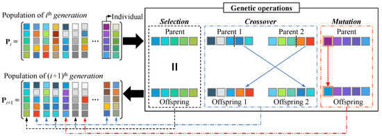 The GA is iterative optimization procedure that repeatedly applies the genetic operations (such as selection, crossover, and mutation) to a group of solutions until a certain criterion is met. In the GA, a search point (solution), which is the setting of a search space with m dimensions (m variables), is coded into a string similar to the chromosome (or individual). The individual is composed of m characters, , which are analogous to the m genes. A fitness value is used to represent the degree of goodness of the individual. The set of individuals is called the population, , and each iteration step to obtain a new population is called a generation. In each generation, GA generates a new population from the previous population using a given set of genetic operations (such as selection, crossover, and mutation). It then replaces inferior individuals with a superior newly generated individual to obtain a better population [16]. A typical selection operation reproduces an individual. A typical crossover operation randomly splits the two individuals at a randomly selected point and exchanges parts between them. A typical mutation operation alters an individual at a random point. The mechanism of each genetic operation and the process of generating the new population through genetic operations are shown in Figure 2. The basic GA procedures include the following steps.
