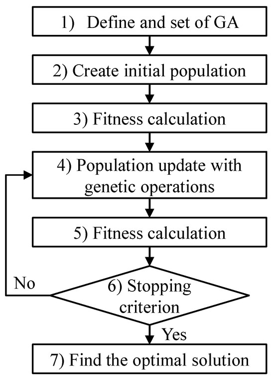 After completing the GA procedure, the optimal solution is obtained by selecting the fittest individual from the final generated population. The flowchart of the base GA is shown in Figure 3.
