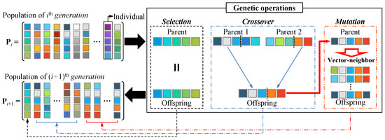 The procedure of the proposed HGA is almost identical to that of the basic GA, except for a mechanism to update the population using genetic operations. Figure 4 shows the population update mechanism of the proposed HGA. As described in Section 3.1, the selection operation of the proposed HGA is performed only once, and only the fittest individual is selected and copied to the next population. Unlike the crossover of the basic GA, the crossover of the proposed HGA generates only one offspring in a single crossover operation such that all offspring generated by the crossover can be different. The mutation operation of the proposed HGA performs a completely different operation to that of the mutation operation of the basic GA. The mutation operation of proposed HGA performs a neighborhood search that generates the vector-neighbor of a parent and insert them into the next population, where m is the dimension of the individual and N denotes the number of nearby neighbors, respectively. Moreover, the parent for the mutation operation of the proposed HGA is selected from the crossover, not the current population. Therefore, the genetic operations of the proposed HGA are performed in the order of selection, crossover, and mutation.