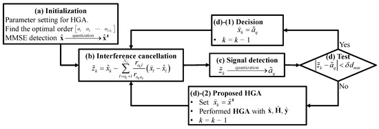The layered structure is inspired by the approaches suggested in [14,20,27]. In particular, the detection with a layered structure [27] that update the solution vector under consideration within the specific layer is adopted with the proposed HGA. The layered HGA (LHGA) basically performs MMSE successive interference cancellation detection based on QR decomposition, and the proposed HGA in each layer is applied.