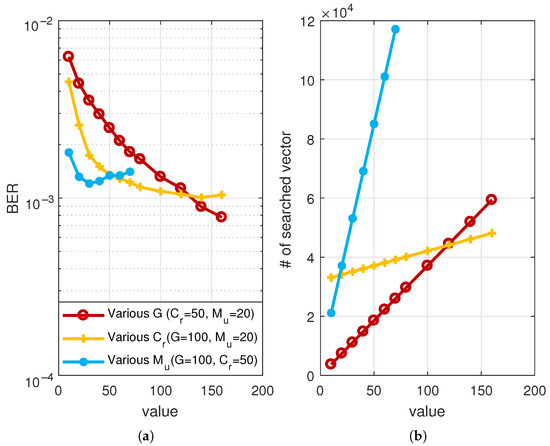 Unfortunately, there is no known method for determining GA parameters, so we need to make a heuristic decision. Figure 6 shows BER performance and the number of vectors to be searched in the HGA process for various parameters in a MIMO with 64-QAM at a signal-to-noise ratio (SNR) of 30 dB. In this paper, we use the number of vectors that should be searched by the HGA as a measure of complexity. From Figure 6a, BER performance is improved as the and increase, but can not significantly affect the BER performance. However, in Figure 6b, the complexity of the HGA process increases sharply as increases, whereas the change in and slowly increase the complexity of the HGA. From these simulation results, we can select the HGA parameters with lower complexity and better BER performance. The selected parameters according to the modulation order for a MIMO system are summarized in Table 1. In addition, for fair performance comparisons, the parameters for the basic GA have been chosen to have a similar population structure to that of the HGA, and are listed in Table 2.
