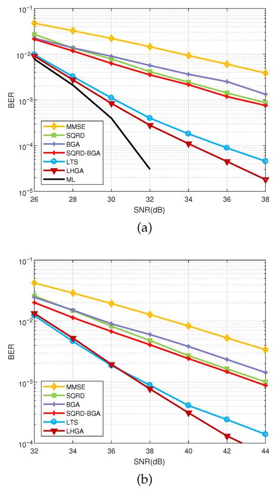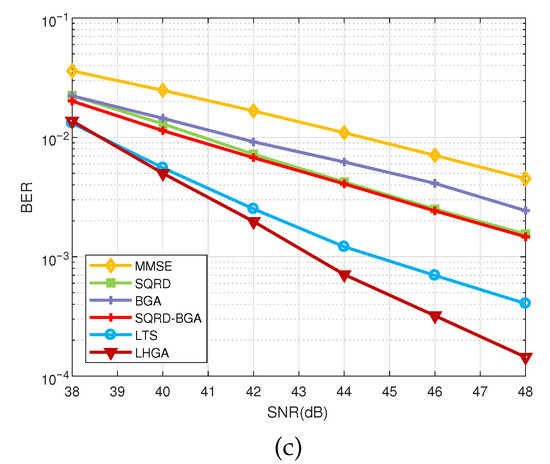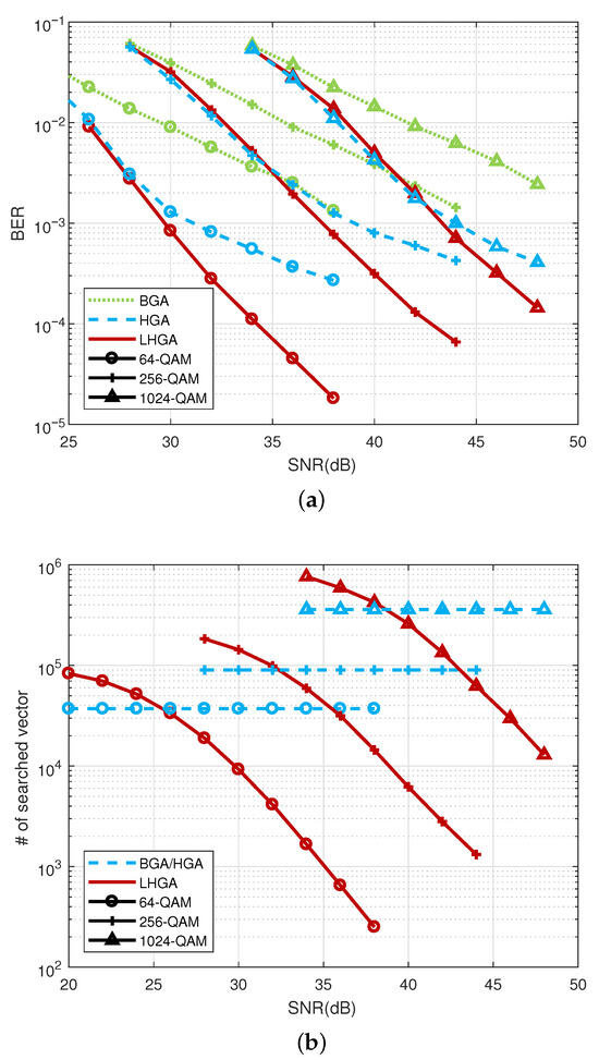 Figure 7a shows a BER performances comparison between the proposed HGA without and with layering and the basic GA (BGA) without layering in a MIMO system with 64-QAM, 256-QAM, and 1024-QAM. It can be seen that compared to the basic GA without layering, the proposed layered HGA approach significantly improves BER performance. For example, the basic GA without layering needs an SNR of 39 dB to achieve a BER for 64-QAM, whereas the proposed HGA without layering achieves the same BER at 31 dB, which amounts to an SNR gain of 8 dB. Moreover, the LHGA further improves BER performance. For 256-QAM and 1024-QAM, this SNR gain is equal or even higher.