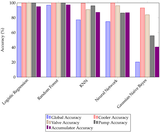 The condition monitoring of hydraulic systems dataset (ZEMA) was divided into four subprocesses: cooler, valve, pump, and accumulator. Experimentation was conducted using five machine learning algorithms: random forest, logistic regression, K nearest neighbors (KNN), neural network, and Gaussian naive Bayes. The accuracy results for each algorithm across the four subprocesses (Figure 3), as well as the global accuracy, are presented in Table 7 and Table 8.