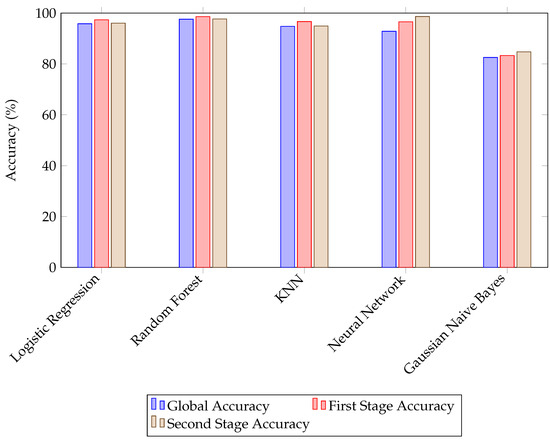 K nearest neighbors (KNN) and neural networks, while having slightly lower global accuracies (94.79% and 92.83%, respectively) also demonstrated significant improvements. KNN reached 96.65% accuracy in the first stage and 94.89% in the second stage, showing better performance when focusing on specific stages. Neural networks, despite their lower global performance, excelled in the second stage, achieving the highest accuracy among all models at 98.63%, though their first stage performance remained at 95.65%, still an improvement over the global score.