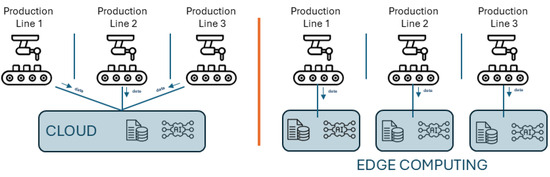 To better illustrate the deployment of edge computing models and their comparison with traditional cloud computing systems, we included a graphical representation of their integration into a typical industrial IT infrastructure. The right side of Figure 5 shows the flow of data from IoT-enabled machines and sensors to edge devices, where real-time processing occurs. This local processing significantly reduces latency and supports immediate decision-making.