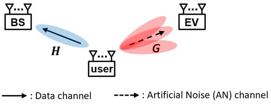 As shown in Figure 1, we consider uplink secure communication that consists of one type of user equipment (UE, legitimate transmitter), one desired base station (BS, legitimate receiver), and one passive EV. The UE, BS, and EV equip M, N, and  antennas, respectively. In the proposed scheme, the UE transmits the desired data using a beam while generating a jamming signal and transmits it to the EV using multiple beams to enable secure communications against EV attacks. Regarding channel estimation, the reference signals are transmitted from the UE to the BS so that the channel state information (CSI) between the BS and the UE is available at the BS. Since the EV can listen to the reference signals transmitted from the UE, it is assumed that the CSI from the UE to the EV is available at the EV. However, it is assumed that the CSI between the BS and the UE is not available at the EV. It is generally difficult for a transmitter to acquire the CSI between the transmitter and the passive EV because the passive EV hides its existence. Thus, it is assumed that the CSI from the EV is not available at either the BS or the UE.
