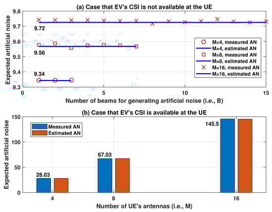 Figure 3 shows the expected AN at the EV with or without the availability of the EV’s CSI at the UE when N and  are set to 8. In the case when the EV’s CSI is not available at the UE, the expected AN values based on (12) and (14), i.e., estimated AN, are identical to the corresponding simulation results, i.e., measured AN, as shown in Figure 3a, and its value is equal to . When M is 4, 8, and 16,  is provided as , , and , respectively, which is the identical value of the estimated AN for each M. As discussed in Section 3.1, the expected AN is  regardless of the number of beams, B. The expected AN increases as M increases because an increase in M increases , decreasing , and, accordingly,  increases. In the case when the EV’s CSI is available at the UE, the expected AN values based on (25), i.e., estimated AN, are identical to the corresponding simulation results, i.e., measured AN, as shown in Figure 3b, and its value is equal to . When M is 4, 8, and 16, the measured AN values in Figure 3a are , , and , and the measured AN values in Figure 3b are , , and . As discussed in Section 3.1, when the CSI of the EV is present, we observe that the expected AN is increased by a factor of  compared to the expected AN when the CSI of the EV is absent.