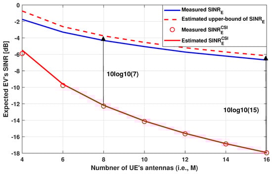 Figure 4 shows the expected  when N and  are set to 8. In the case when the EV’s CSI is not available at the UE, the upper bound of the expected  based on (20) shows the tight upper bound for the simulated , i.e., measured . In the case when the EV’s CSI is available at the UE, the expected  based on (28), i.e., estimated , is tightly matched to the corresponding simulation results, i.e., measured . Furthermore, we can observe that the upper bounds of the expected  and expected  differ by a value of , according to (20) and (28). For example, when M is 8 and 16, the SINR gaps between the estimated  and  are  dB  and  dB , respectively.