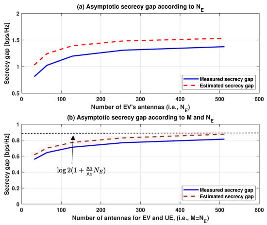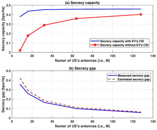 Figure 5 shows the secrecy capacity and secrecy gap according to M when N and  are set to 8. Increasing M makes  smaller and increases , which in turn increases the AN in both the cases with and without the EV’s CSI, as shown in (12), (14), and (25). Thus, increasing M decreases the expected EV’s SINR, as shown in (20) and (28). Since the case when the EV’s CSI is available at the UE can show the optimal performance in terms of secrecy capacity due to efficient AN generation, it shows ideal performance compared to the case without the EV’s CSI at the UE. However, as M increases, the secrecy capacity in a practical environment without the EV’s CSI at the UE approaches the ideal performance. As shown in Figure 5a, when M is 8, the secrecy capacity without the EV’s CSI achieves  of the secrecy capacity with the EV’s CSI. However, as M increases to 128, the secrecy capacity without the EV’s CSI achieves  of the secrecy capacity with the EV’s CSI. In other words, the secrecy capacity increases with M, and its gap, i.e., secrecy gap, converges to zero, as analyzed in (37). The analyzed asymptotic secrecy gap based on (37), i.e., estimated secrecy gap, shows the tight upper bound for the corresponding simulation results, i.e., measured secrecy gap, as shown in Figure 5b. It is also shown that, as M increases from 8 to 128, the measured secrecy gap effectively decreases from  bps/Hz to  bps/Hz.