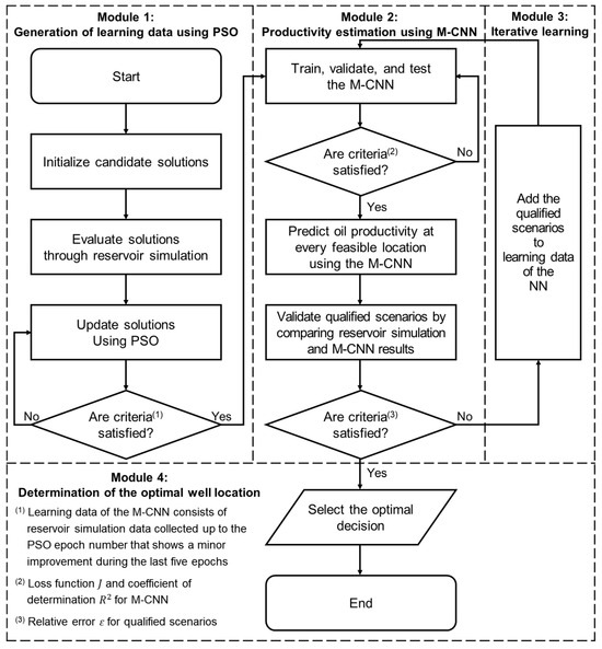 Drawing inspiration from the M-CNN concept [29], this study seeks to enhance the solution quality of well placement problems by mitigating extrapolation effects and optimizing the learning data acquisition process. The performance of M-CNN is affected by the quantity and quality of learning data [32]. Considering the field development cost, the level of difficulty in applying the proxy has increased owing to the small ratio of the available data volume to the domain volume for well placement optimization problems [28]. To develop an efficient proxy, it is essential to balance accuracy and learning data acquisition costs. In the previous studies [28,29,30], generalization was achieved by randomly generating machine learning data, which increased the RS cost. For more efficiently managing the high computational cost of RSs associated with the acquisition of learning data, this study couples an M-CNN with an evolutionary algorithm (i.e., PSO). While PSO and GA are powerful for generating high-quality solutions, their high computational cost, resulting from exhaustive simulation runs, limits their practical application. In contrast, our approach integrates M-CNN with PSO and iterative learning, significantly reducing these costs while enhancing model accuracy. Another challenge in applying machine learning to well placement is the maximization problem that occurs when searching for the most productive region in a reservoir beyond the range of the learning data. Although features are captured well during machine learning interpolation, their predictability for extrapolation tends to deteriorate if the problem is nonlinear and complex [33,34,35]. We believe that the presence of PSO and iterative learning in the proposed framework enables the M-CNN to relieve the cost burden of RS. Constructing an M-CNN learned with PSO results and updating the proxy with iterative learning results are expected to allow the efficient selection of the optimal location with reasonable learning data volume for well placements. To the best of our knowledge, this is the first application of an evolutionary algorithm and iterative learning to obtain a dataset for a deep learning-based proxy model in the well placement optimization problem.