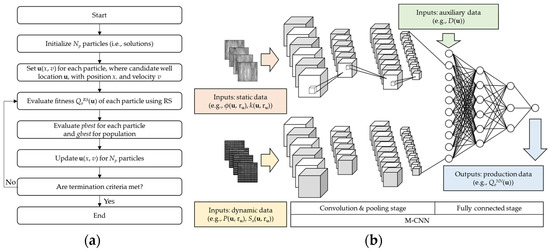 Schematic diagram of the PSO and M-CNN. (a) The PSO evolves solutions that are utilized as learning data of the M-CNN; (b) The M-CNN learns a pattern between inputs (i.e., petrophysical properties) and outputs (i.e., field cumulative oil production) extracted from the PSO solutions (modified from Chu et al. [29]).
