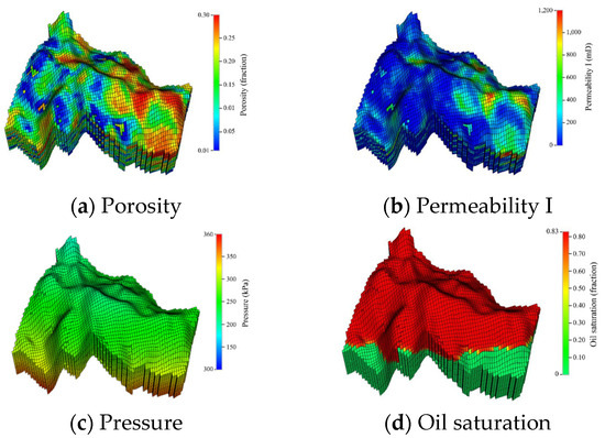 Three-dimensional distributions of petrophysical properties of the UNISIM-I-D. (a) Porosity; (b) permeability I; (c) pressure; (d) oil saturation. The total number of grid blocks is 93,960, with 36,403 of those being active.